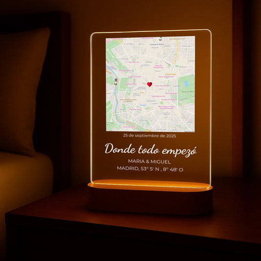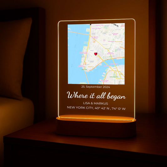 “Dove tutto è iniziato” - Luce notturna personalizzata (incl. base in legno)