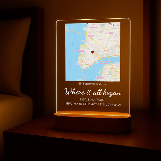 “Where it all began” – Personalized night light (wooden base inclusive)